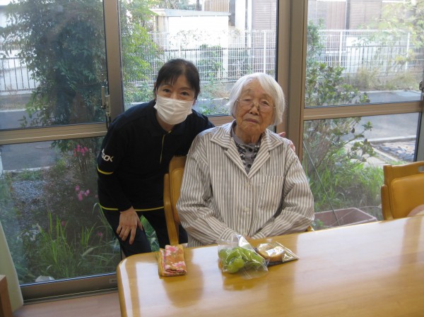 お菓子と果物をお持ちくださりました。おやつに美味しくいただきました。