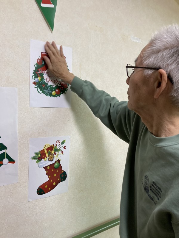 12月の壁面飾りとしてクリスマスの飾りを少しづつ始めました。