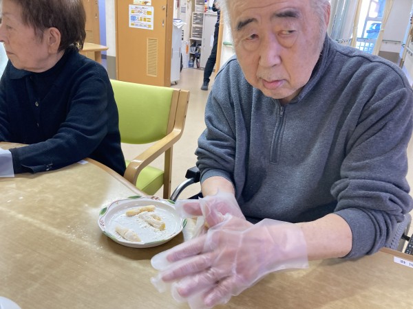 今日は、皆が大好きな かりんとう作りをしました(^O^)/(*^^)v 手袋はめて生地をコロコロ丸めて、「これは私の分よ!」とか「これ全部食べてもいいの?」なんて欲張りさんもいて(≧▽≦)