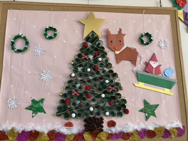 折り紙でのリースとサンタクロースができてますよ (^-^)