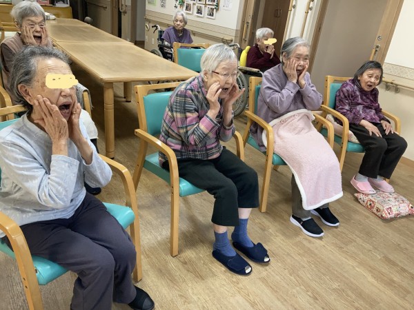 呼吸法から全体へ、声も出しながらの口腔体操です。