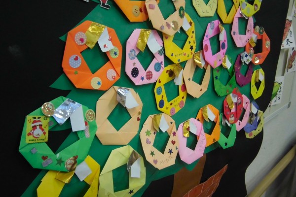 今回は食堂に飾る用に、折り紙のリースを飾りつけしました♪
