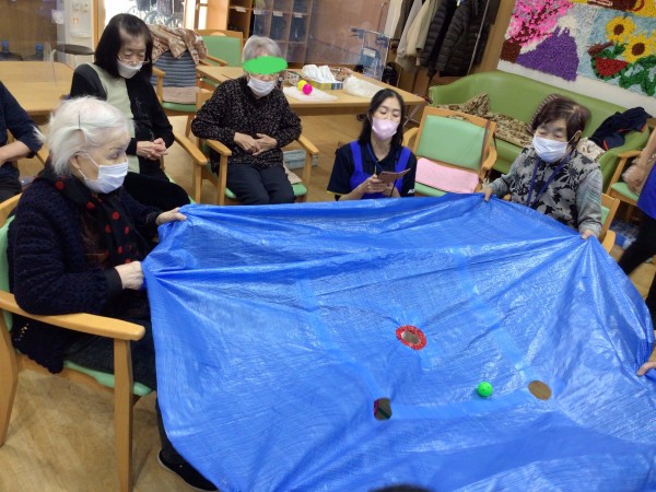 これは、皆で協力しながらブルーシートの穴にピンポン玉を入れていくゲームです。これが中々難しくて、皆さん童心にかえったように「キャーキャー」と声を上げながら楽しんでいました????