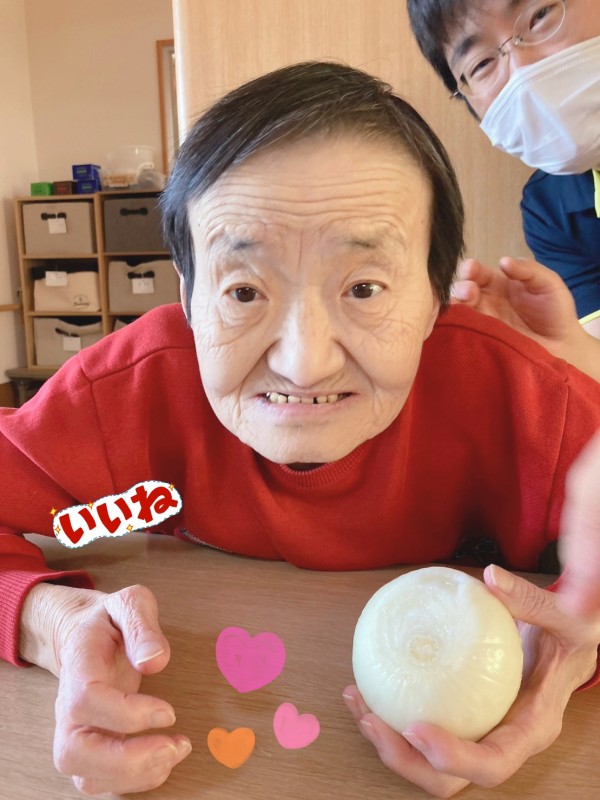 玉ねぎを渡し、「ポトフを作りますよ」との声掛けに対し笑顔で頷く様子が見られました。
