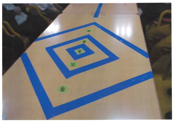カーリングのストーンをカップに変えて卓上で楽しむカップカーリング。カップの中にはゴルフボールが入っていてスライドして投げるので少しコツがいりますが、慣れれば簡単に楽しめるカーリングです。お一人様、1ゲーム3投を2回の合計点数を競いました。1ゲームの最高得点は900点、総合優勝の得点は合計1100点。