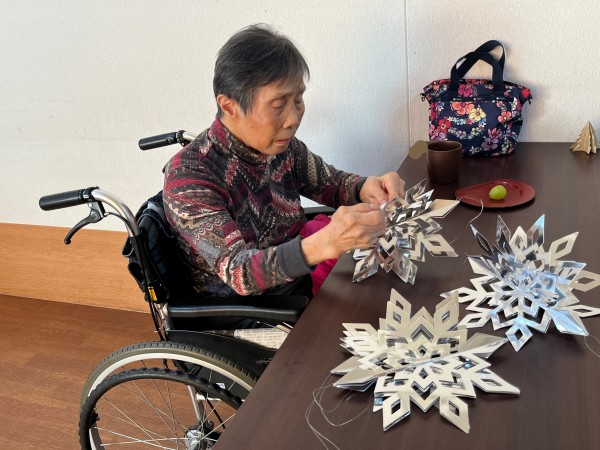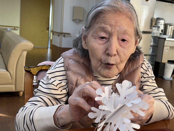 ご入居者様が切っているのは、ケアスタッフの石井さんが一緒に作っていた雪の結晶。