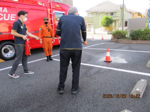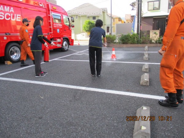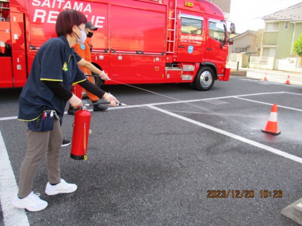避難訓練を終えた後、施設の外で消化器の仕方を教えてもらいました!