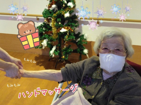 クリスマスツリーの前では、職員がハンドマッサージのプレゼント♡