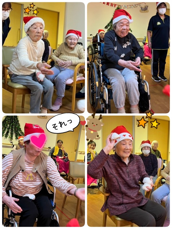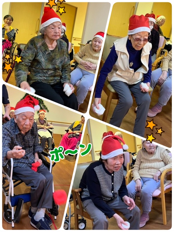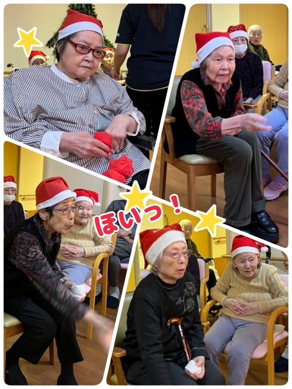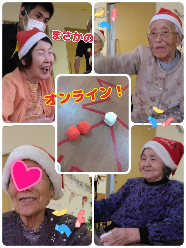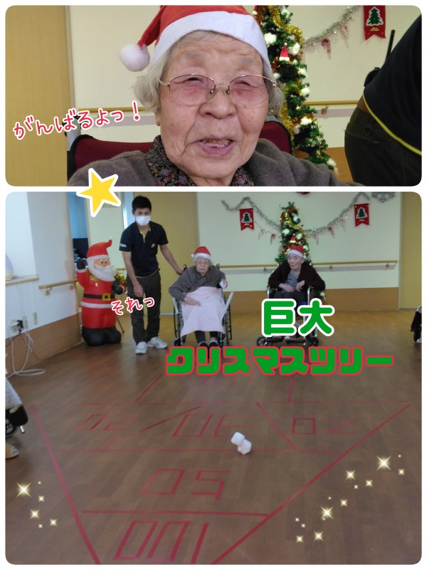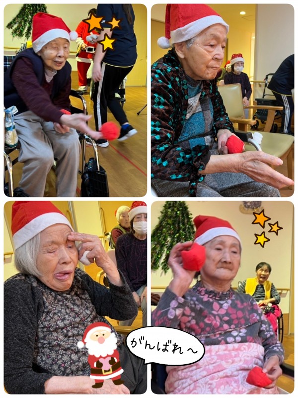 床に描かれたクリスマスツリーめがけて玉を投げます。
