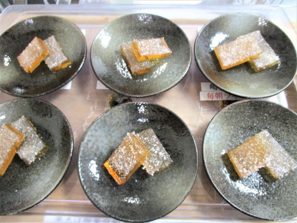 市販の梅エキスをゼリーで固めて粉砂糖をたっぷりふりかけました。