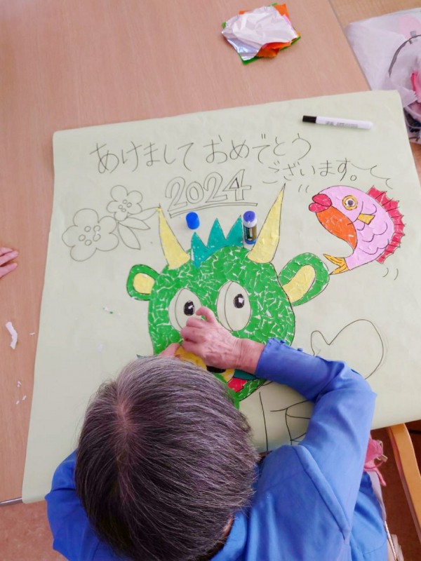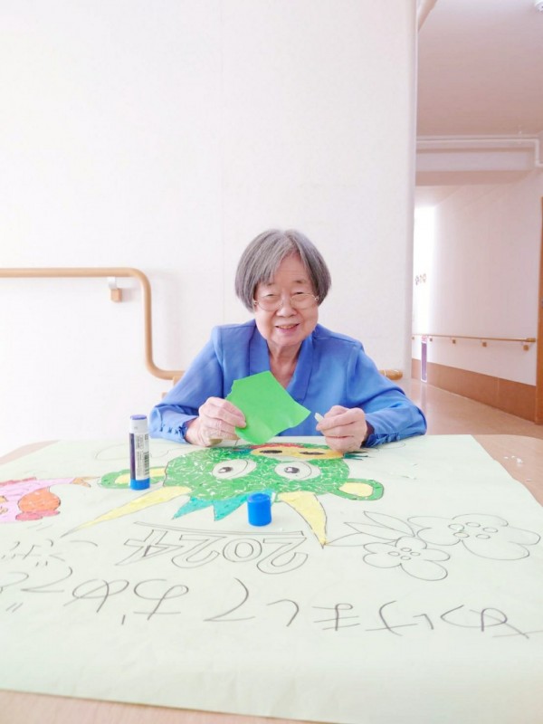 下絵は絵がとっても上手なS職員が描きました。S職員はどんな小さな絵でも大きく拡大コピーができる特殊能力を持っています。今回も大きな紙に拡大して「ヌゥ」を描いてくれました。絵の色の指示を紙に書いて利用者様のM様とK様がちぎった折り紙を貼って下さいました。