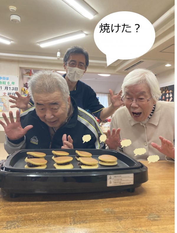 こんにちわ!今日のおやつレクはホットプレートでどら焼きを作りました。