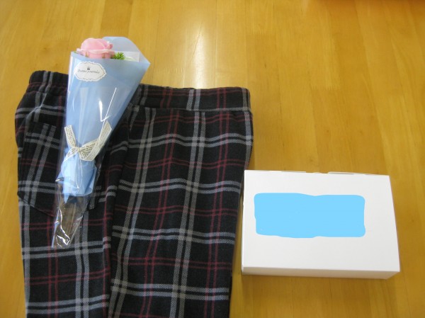 お誕生日おめでとうございます。1/13で95歳になりました。お花とズボンとお菓子を頂きました????