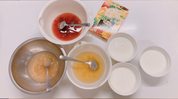 今回のフルーチェの味は『いちご』『カルピスピーチ』『ピーチマスカット』の3つを3グループでつくりました!