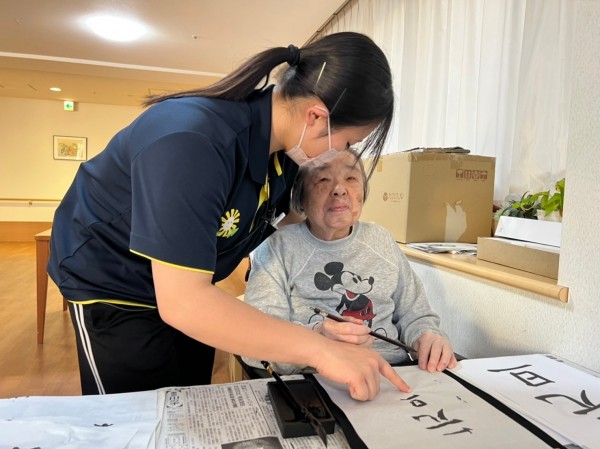 「凄いお上手ですぅ」とケアスタッフの佐井賀さん
