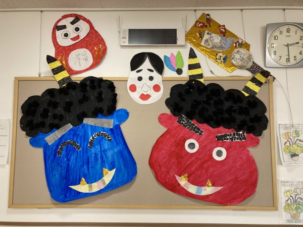 何を作っているか分かりますか?鬼が持っている物と言えば…。前回絵の具で塗っていた大きな鬼が少しずつ完成しました〜╰(*´︶`*)╯♡
