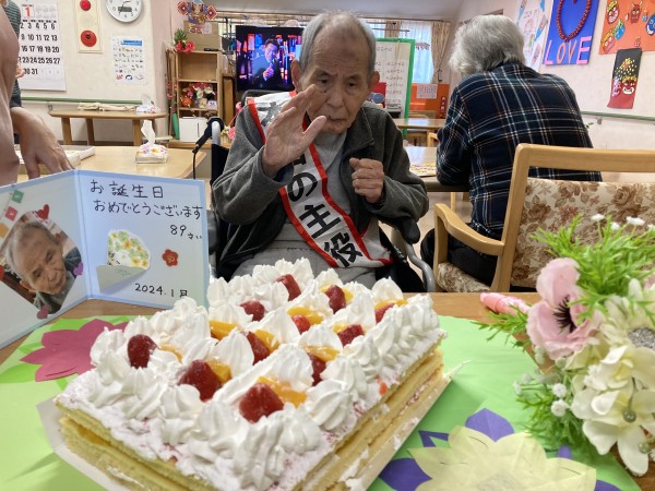 今日は、一月・二月生まれの方のお誕生会を開きました。大きなケーキを作り沢山召し上がって頂きました。
