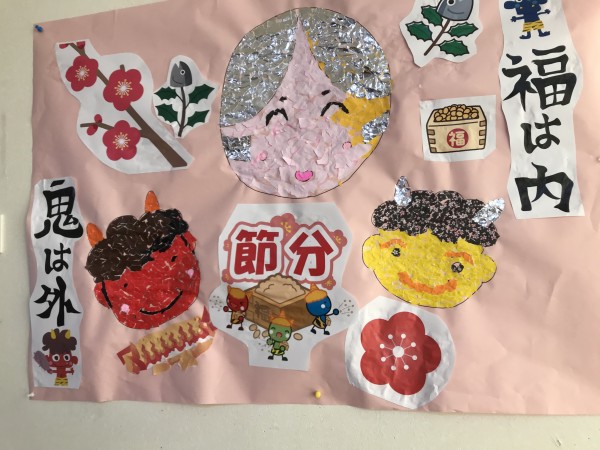 皆さんでの手作り感満載の節分壁飾りです(^_-)-☆