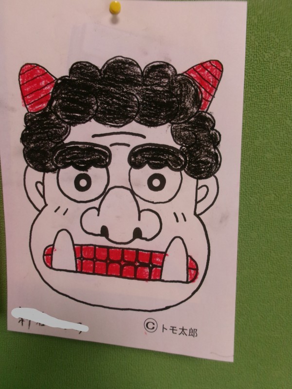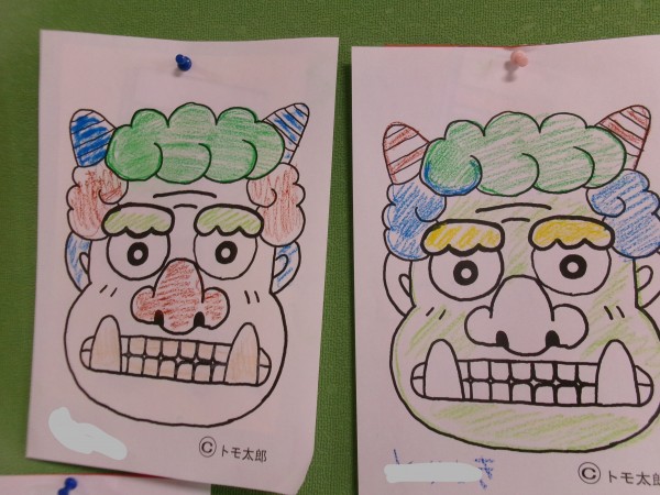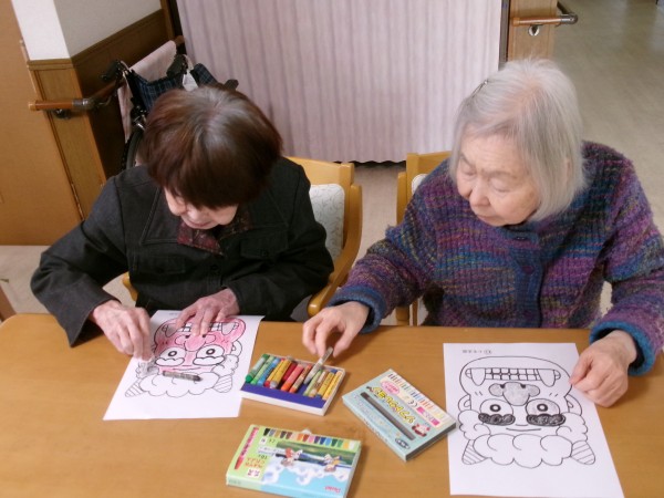 1/28 昼下がり、節分に向けて鬼の塗り絵を致しました!色んな鬼さんが出来ました!私に似てる~!っと笑う利用者様(>_