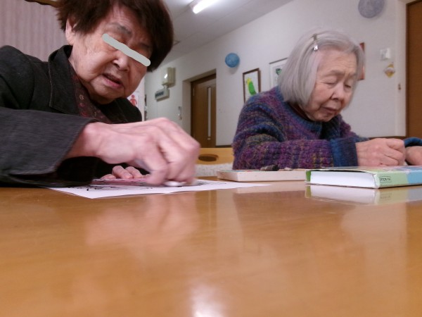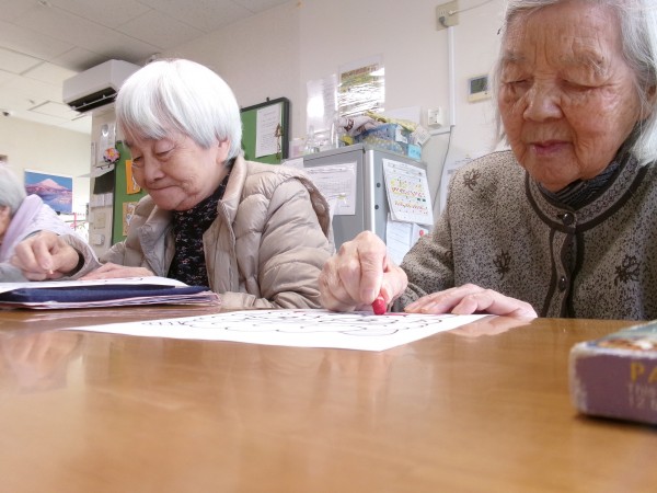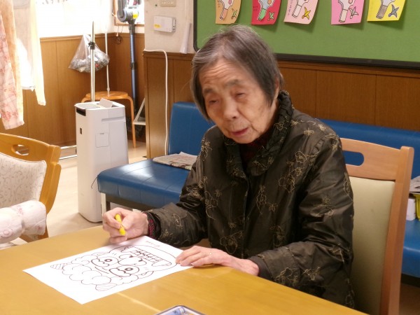3. 1/28 昼下がり、節分に向けて鬼の塗り絵を致しました!色んな鬼さんが出来ました!私に似てる~!っと笑う利用者様(>_