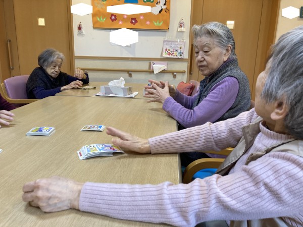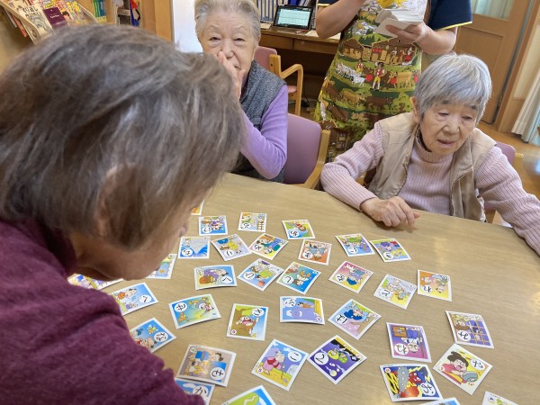 読み札を読むのに従って、場に散らしたそれに対する取り札を取り合って遊びました。