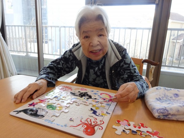 「このピースはここかしら、、、ここに置いてこれはここで、、、」