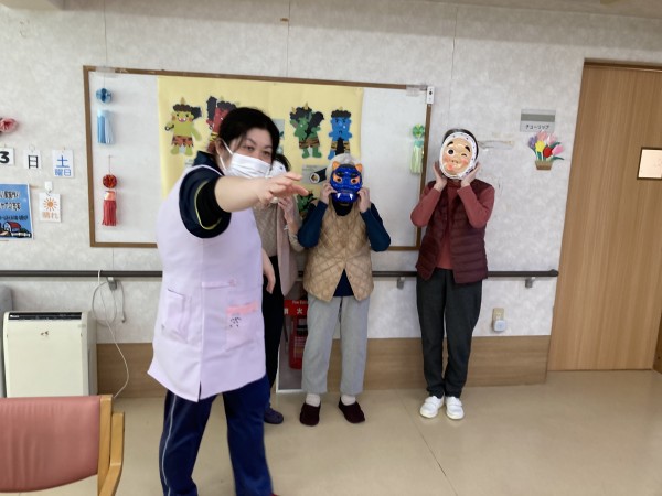 豆まきは 日本の伝統文化 いつも静かなご利用者様も凄く楽しそうに豆をぶつけていました。