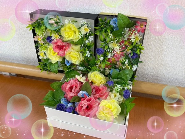 へぇ!空き箱とスポンジと造花でフラワーボックスを作っています。