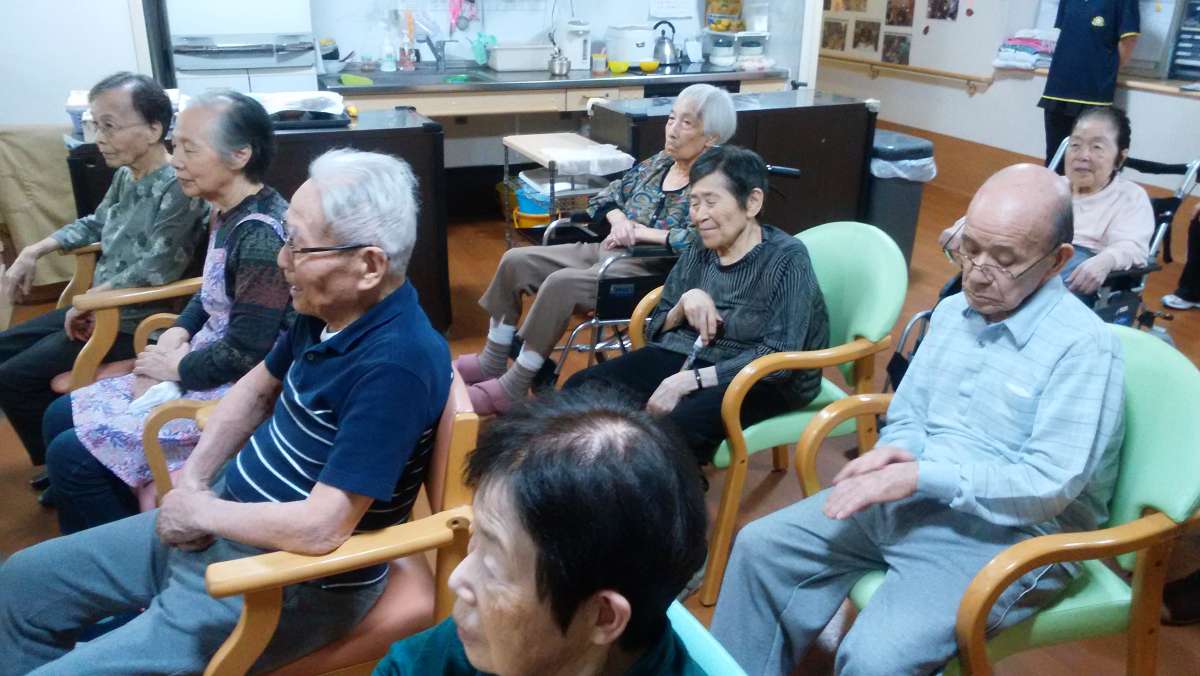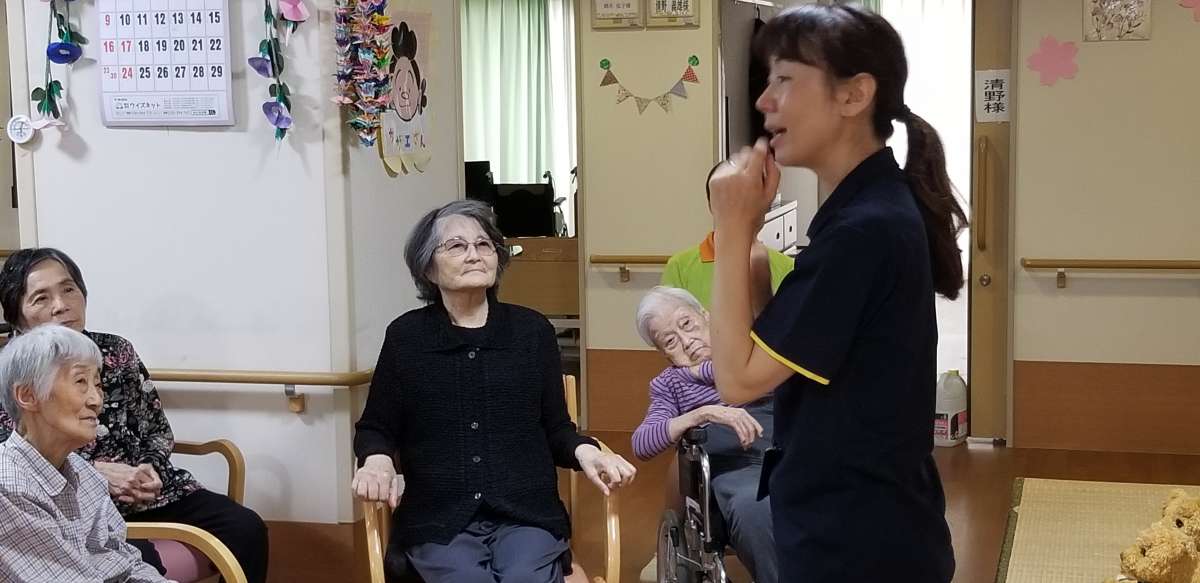 (入居者様、みなさま、見よう見真似で月曜日を表現)