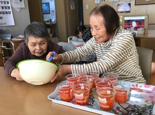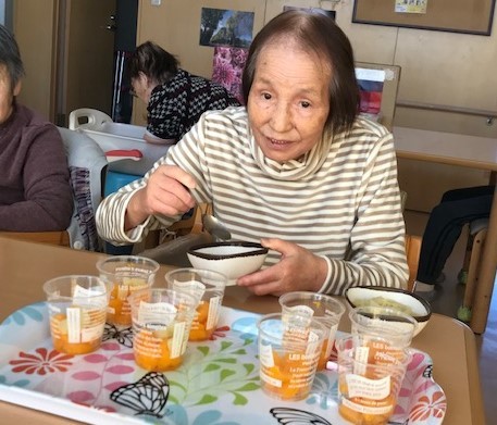 先日1階のおやつ 干し芋のお話をしましたが、2階ではフルーツ缶を使ったおやつをみんな(?)で作りました。
