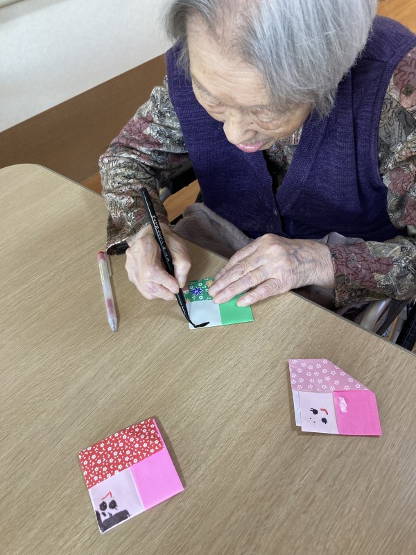 職員と一緒に折り、お顔を書いて頂きました。