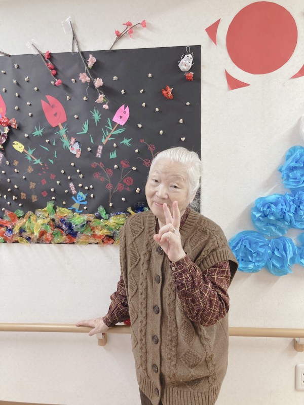I様が壁紙を見て「節分だから鬼なのね。誰が作ったの?」と仰るので、職員ですよと伝えると「こんなの作れるなんて凄いわね~」と感心しておられました。