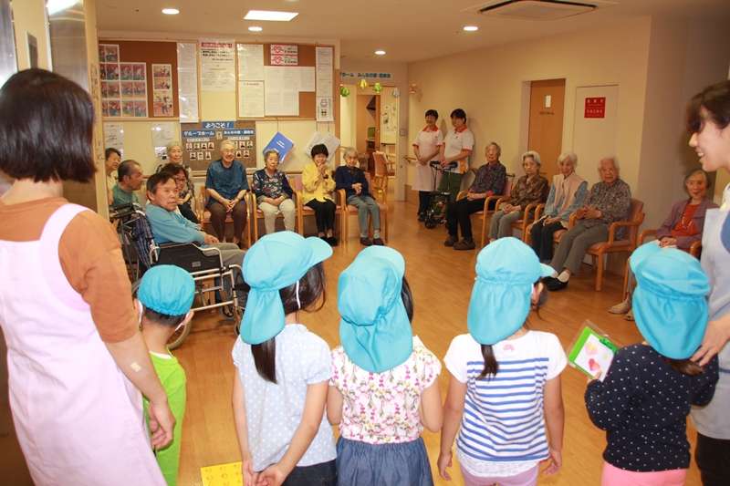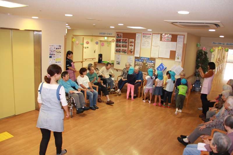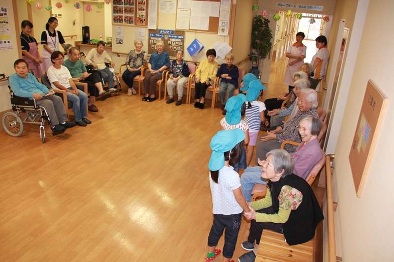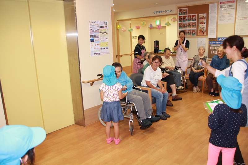 敬老の日を前に、きたしば保育園の年長組5人の園児が、お祝いのお手紙を持って訪問、代表で受け取った