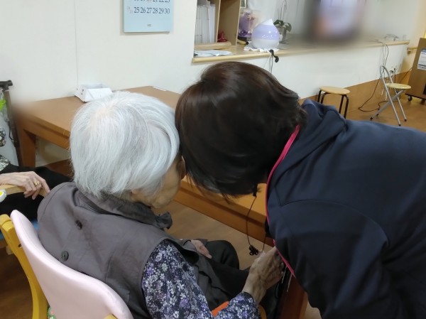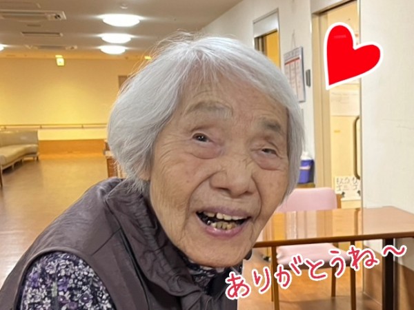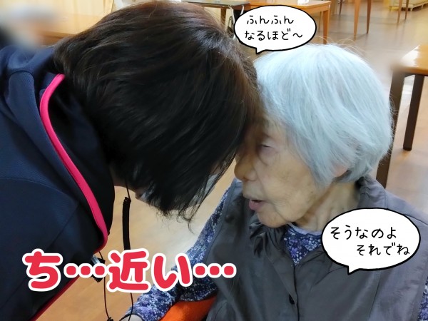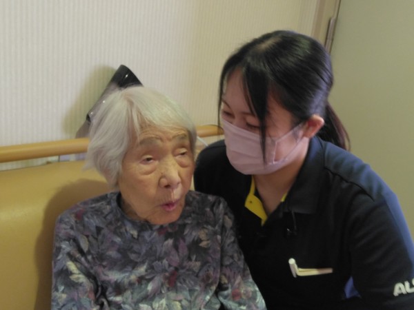 ケアリーダーのこうめさんと104才様がお話ししてます。