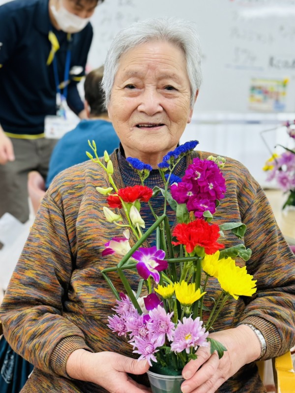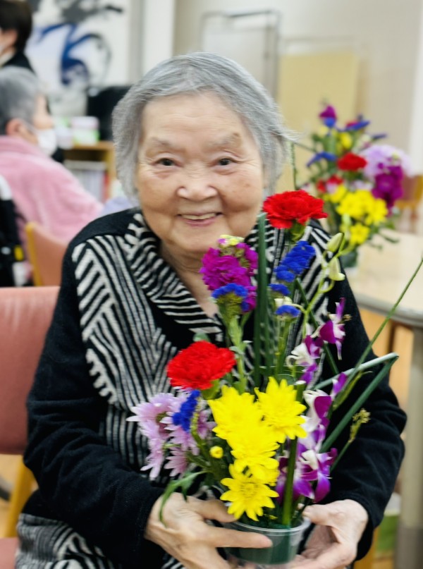 こちらが完成したお花になります。どれも見事に美しいですねー♪ご利用者様と一緒にぱしゃり☆
