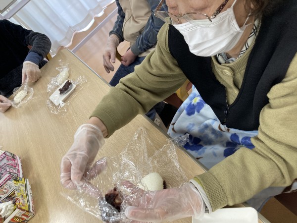 手慣れた手つきで餡子をもち米に包んでいきますよー。いい感じに仕上げてくださいね