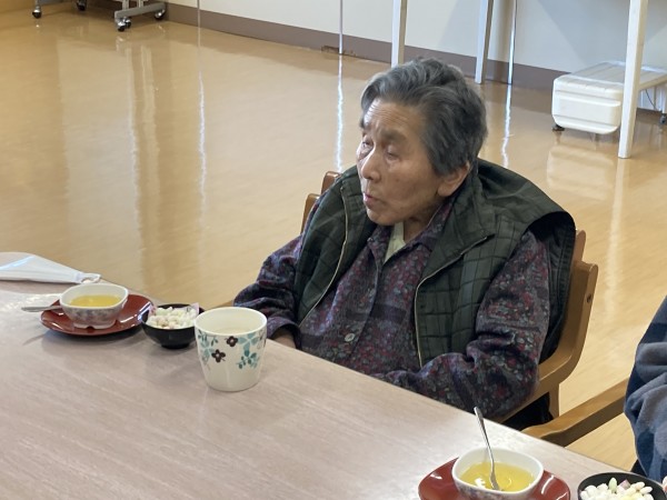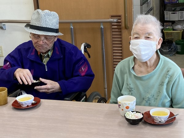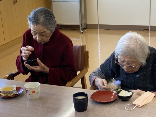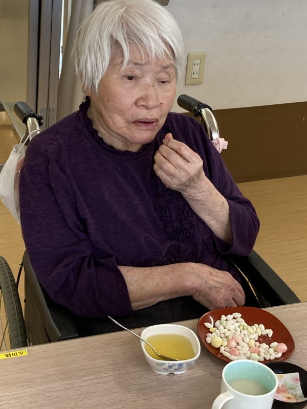 今回のおやつは、ひなあられと甘酒を召し上がっていただきました。久しぶり召し上がる甘酒の味は格別だったご様子で、夜勤で出勤してきた職員が『少しほろ酔いみたい』と申し送りを受けたくらいでした。