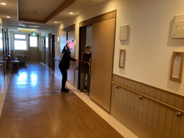 職員が各居室へ周り、「火事です! 避難指示に従い移動してください!」 とお伝えして回ると、皆さま