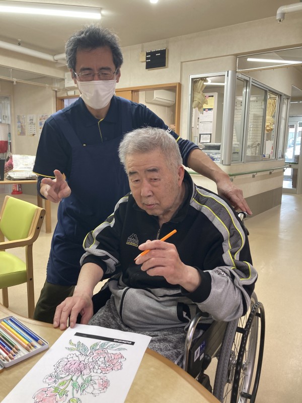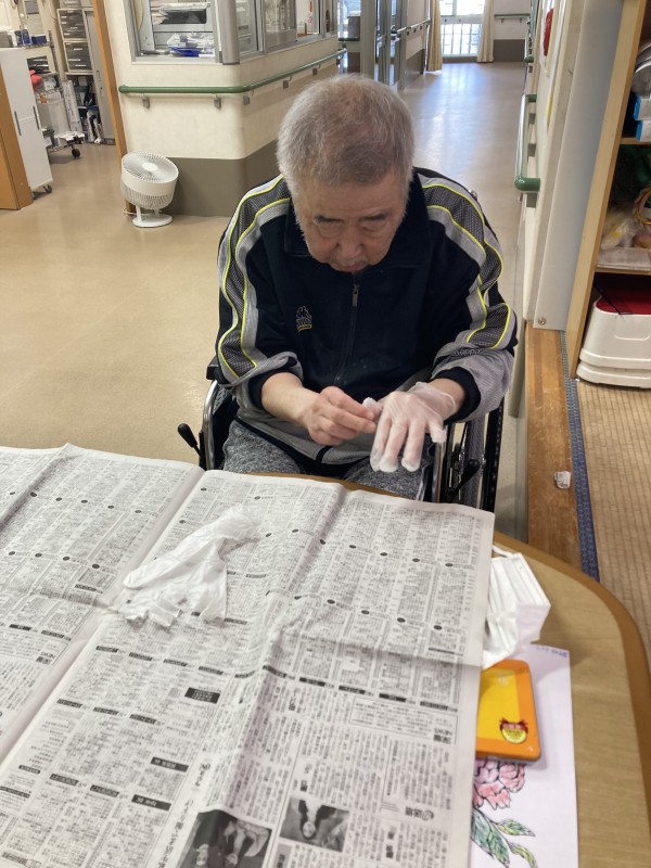 ぬり絵をしたり職員のお手伝いで新聞折りを行いました。皆様とても協力的で助かりました(o^―^o)