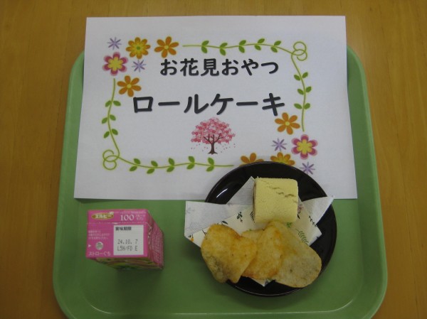 ロールケーキとお菓子とジュースでお花見の感じを味わいました。