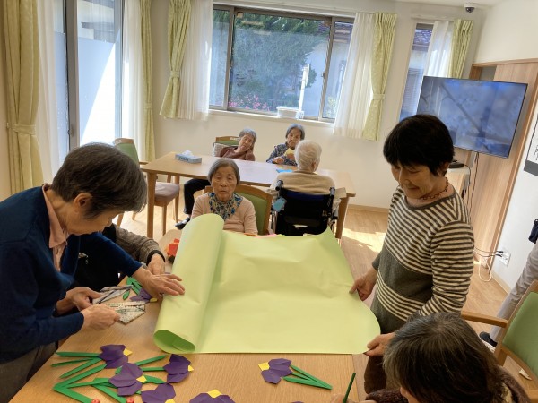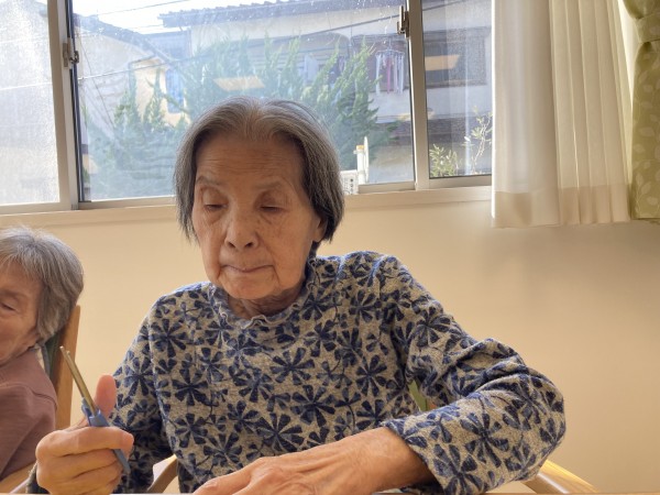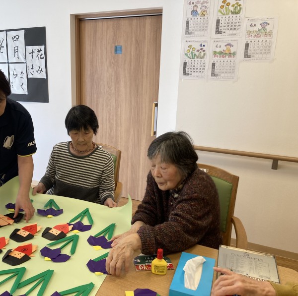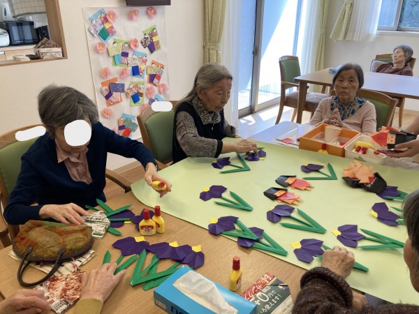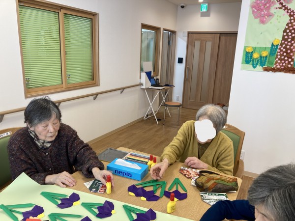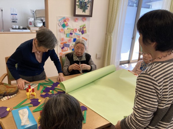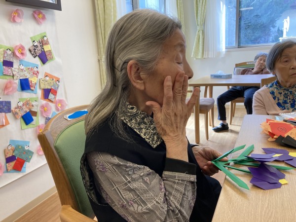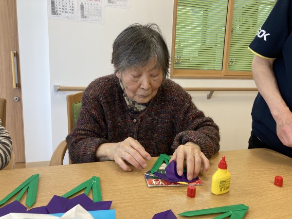 K様、何やら紫と緑の折り紙を使ってある形に折っているみたいですね。職員が付いて折り紙の手順を教わっています
