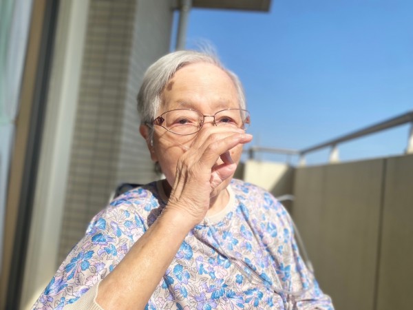 お母様は空を眺めながら日を浴びて