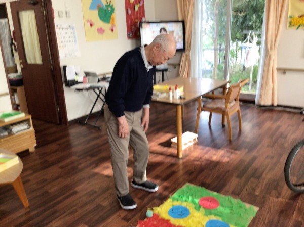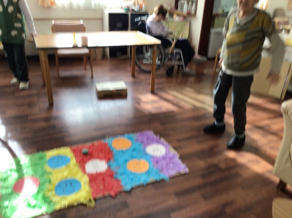 完成したゲーム盤を床に置きその周りに立ちボールを落とします