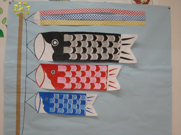 「立派な鯉ができましたね?」とうっとりされていました(*^。^*) 壁に貼り鯉のぼりが完成、泳いでますね!!