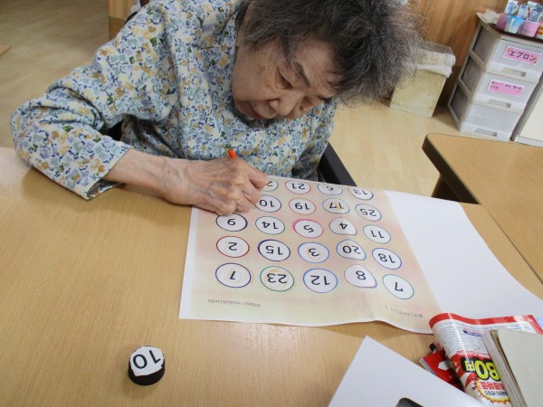 自作のビンゴゲームなので、読み上げた数字を色鉛筆で塗っていただきます!