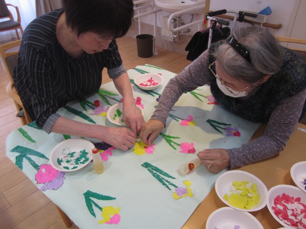 様々の色の折り紙などを細かく契り、ご利用者様の皆様と共に