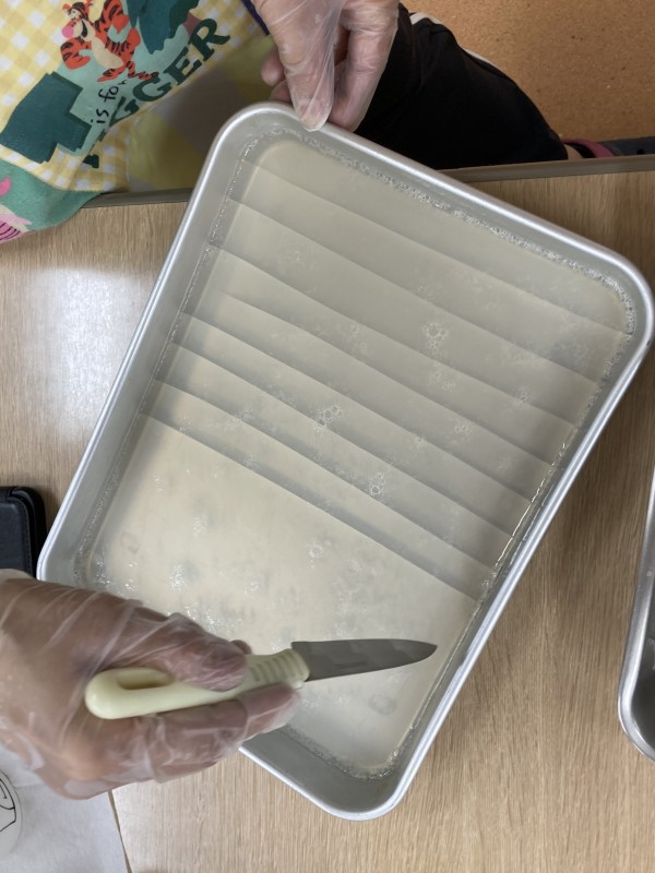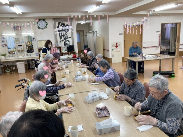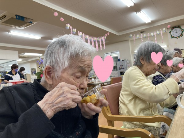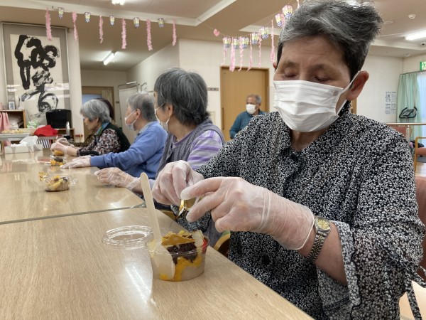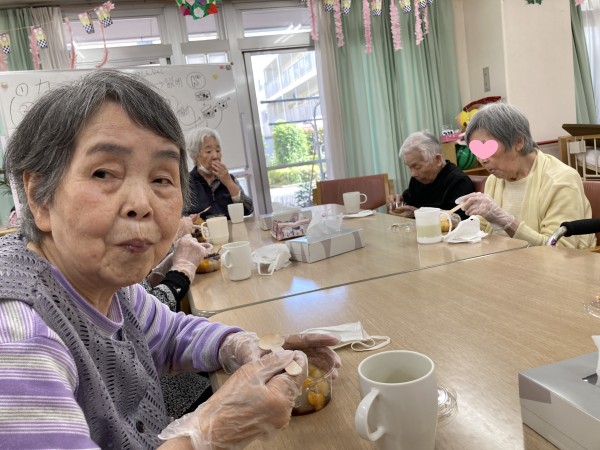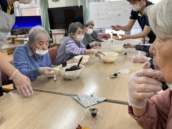 作ったあんみつを皆様と一緒に召し上がっています♪「甘くておいしいー」と絶賛のお言葉をいただきました♪