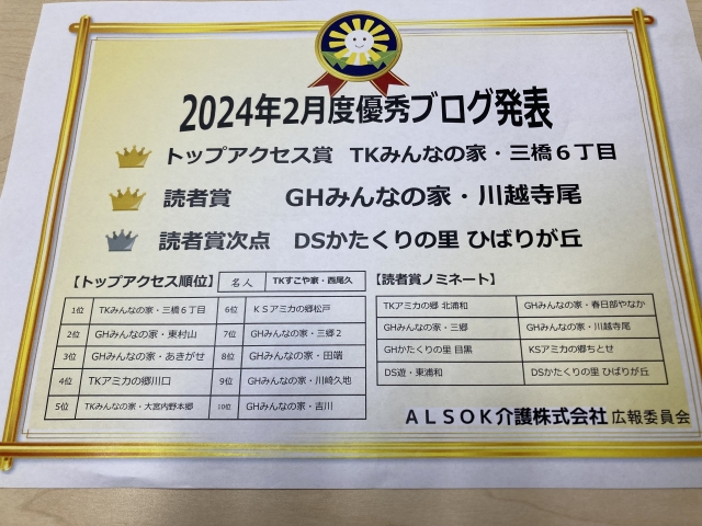 ★☆三橋6丁目のブログが『トップアクセス賞 』で表彰2月度優秀ブログ発表2024年✨ 『みんなの家 三橋6丁目 介護ブログ』☆★