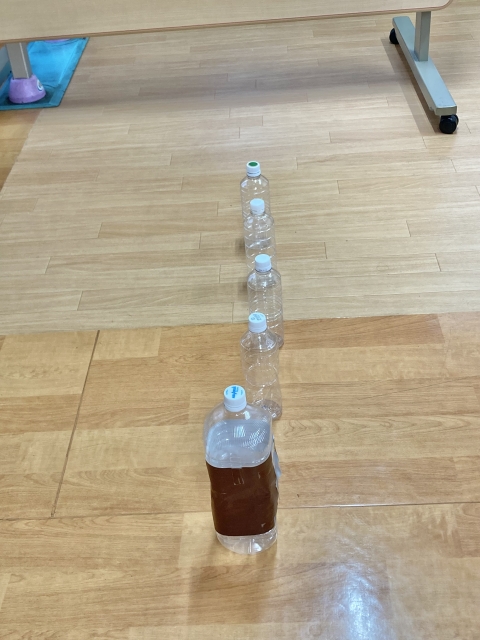 今日のレクは、ボトル倒しです。