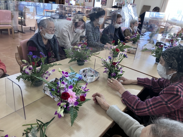 デイサービス遊・志木上宗岡 季節のお花でフラワーアレンジメント(*^▽^*)♪